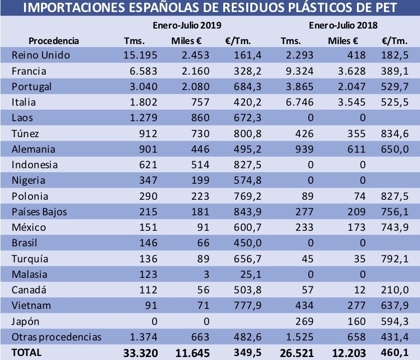 PLASTURGIA SOSTENIBLE, 8-10-19 | Las importaciones españolas de residuos de PET y otros polímeros distintos de poliolefinas, vinílicos o estirénicos, realizadas durante los siete primeros meses de ...