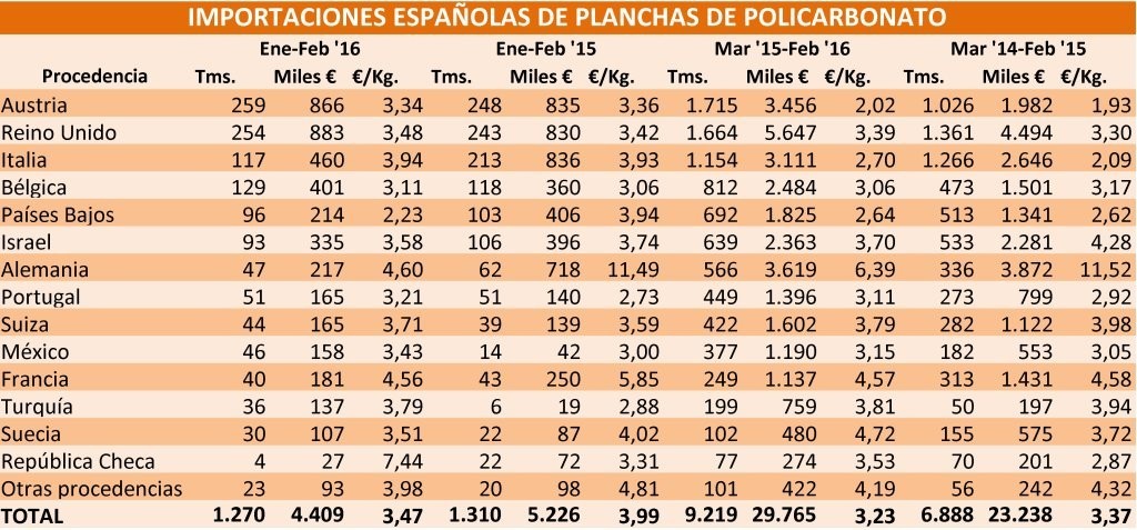 Las importaciones espaolas de planchas de policarbonato se moderan, tras crecer fuertemente en 2015 ...