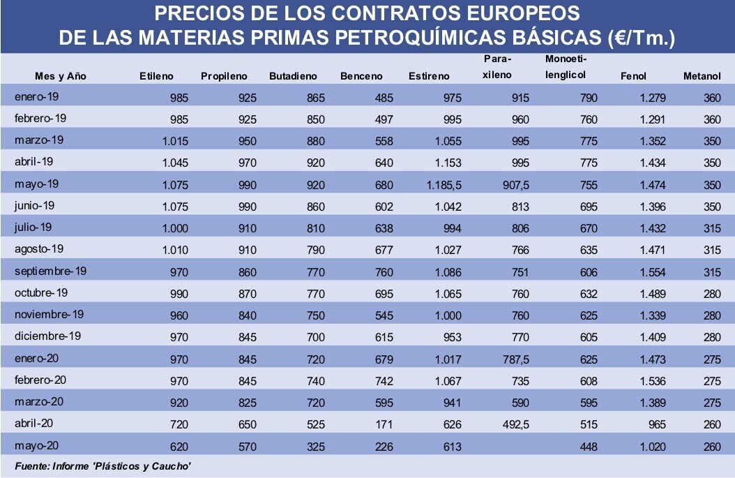Tras el histórico derrumbe registrado en abril, el contrato europeo del benceno ha subido en mayo 55 €/Tm., hasta situarse en 226 €/Tm. Como es habitual, el contrato del fenol, empleado en la producción de policarbonato, varió en la misma cuantía que el del benceno, alcanzando los 1.020 €/Tm.