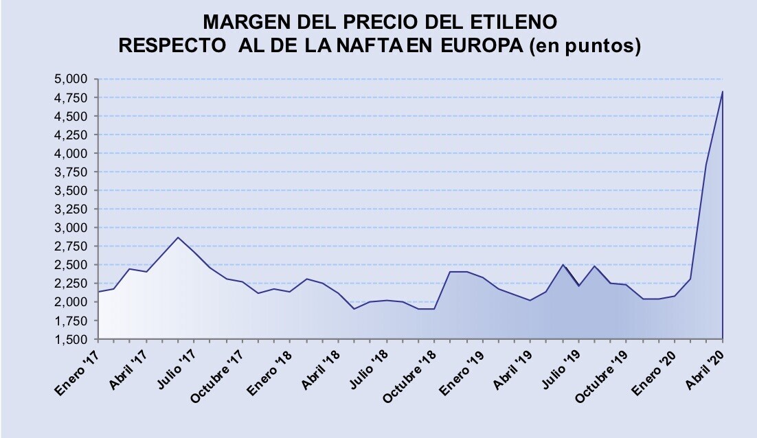 Durante abril, el diferencial del contrato europeo del etileno respecto al precio medio de la nafta se disparó hasta ser 4,83 veces más alto.