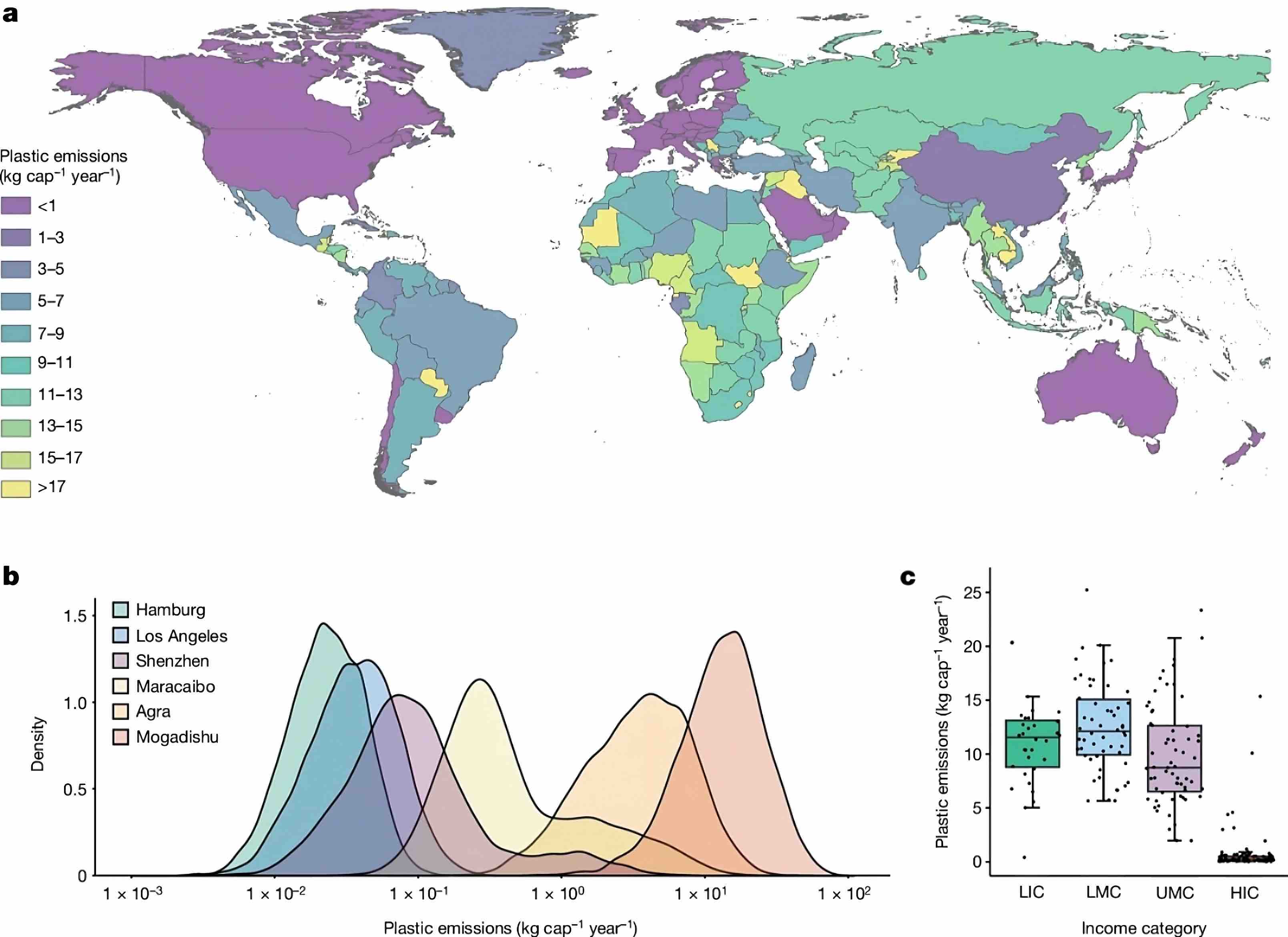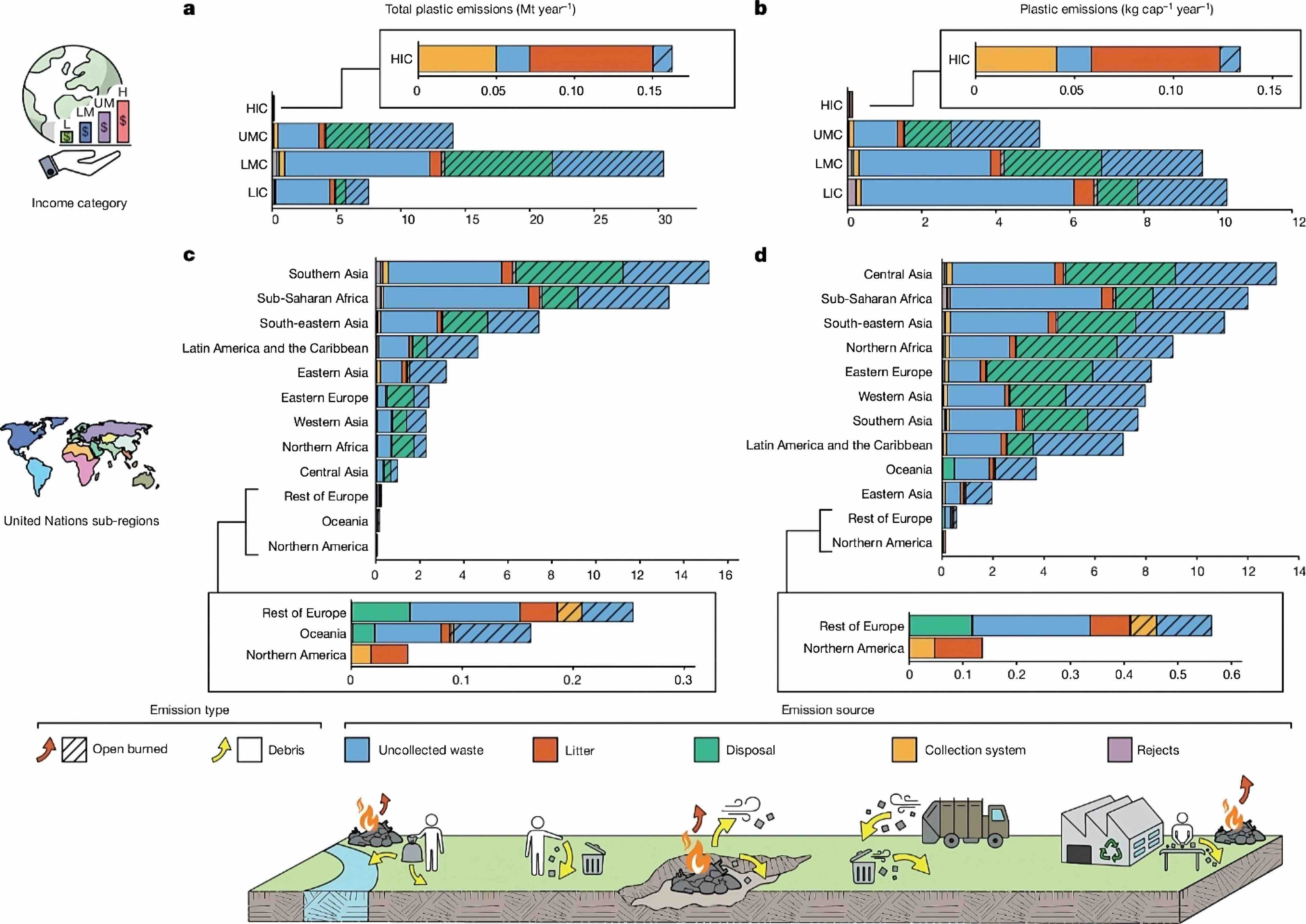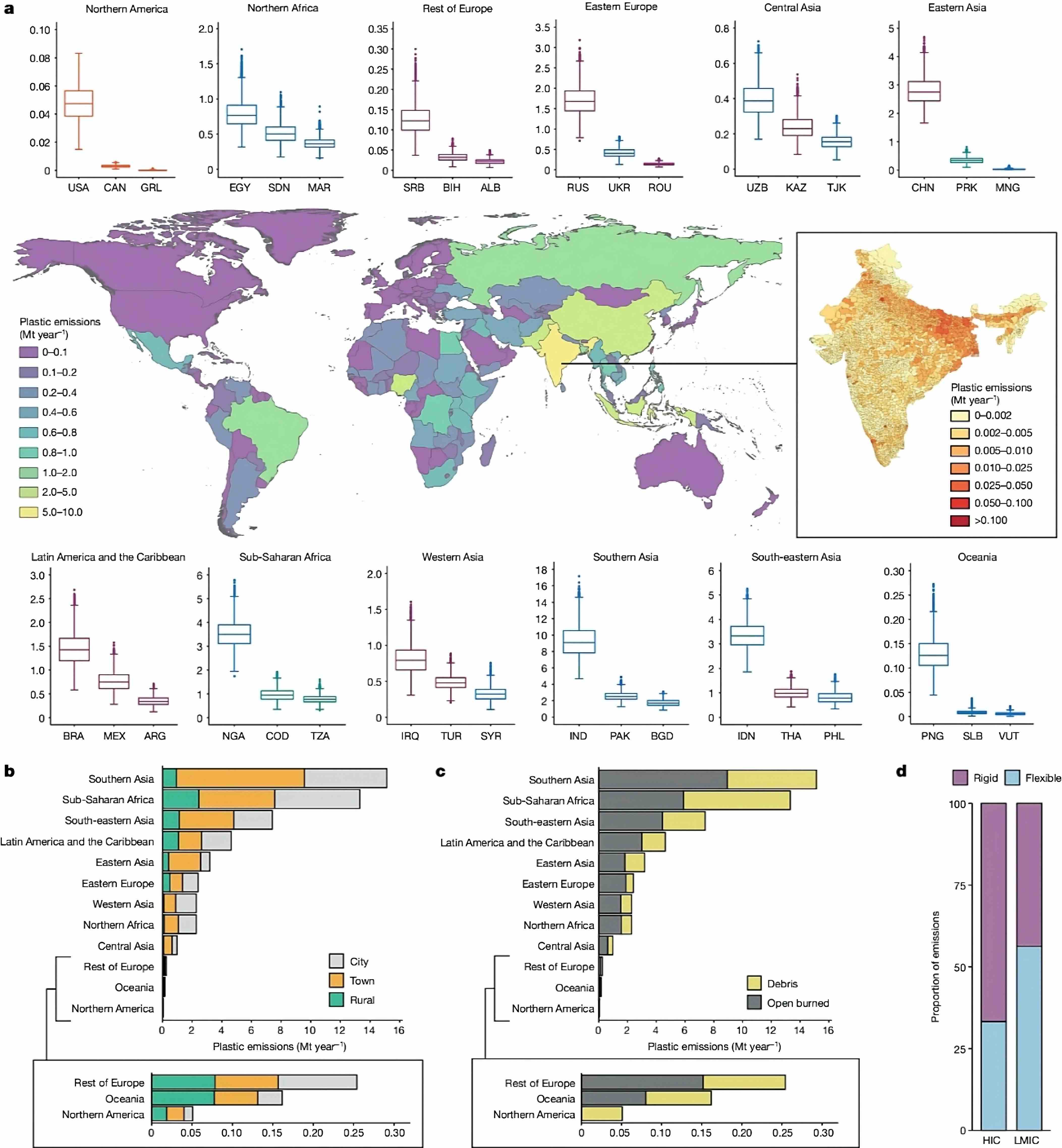 Los países de ingresos bajos y medios generan muchos menos desechos plásticos, pero una gran parte de ellos no se recogen o se eliminan en vertederos. India es el mayor contribuyente porque tiene una gran población (aproximadamente 1.400 millones de habitantes) y gran parte de sus desechos no se recogen. El contraste entre las emisiones de residuos plásticos del Norte y del Sur es marcado. A pesar del alto consumo de plástico, la contaminación por macroplásticos (contaminación por objetos de plástico de más de 5 milímetros) es un problema comparativamente menor en el Norte, donde los sistemas de gestión de residuos funcionan de manera integral. En esta región del planeta, la basura es la principal causa de la contaminación por macroplásticos.