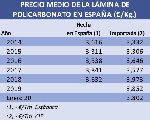 Las importaciones españolas de láminas de PC se mantuvieron estabilizadas en 2019, mientras que el precio medio del semielaborado importado registró un moderado descenso del 3%, respecto a 2018.