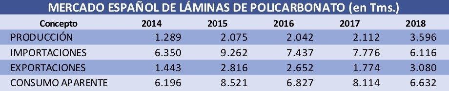 El consumo aparente de planchas de policarbonato viene sufriendo relevantes altibajos en España, oscilando entre unas 6.200 y poco más de 8.000 Tms./año.
