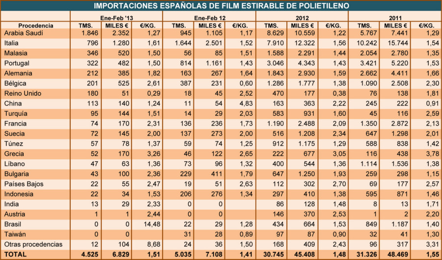 Las importaciones españolas de film estirable de polietileno bajaron un 10,1% en los dos primeros meses de 2013, acentuándose la nueva hegemonía de Arabia Saudita como principal suministrador exterior ...