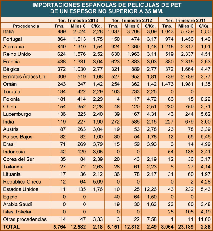 Impulsadas por las procedentes de Portugal, las importaciones españolas de film de PET aumentaron un 11,9% en el primer trimestre de 2013, en tanto que el precio medio de la película importada fue un ...