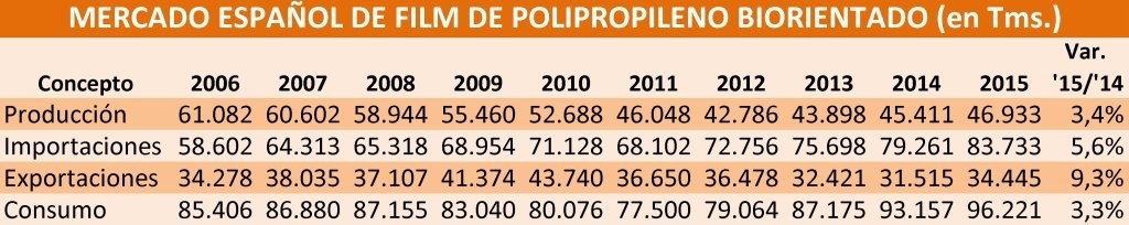 Jueves, 15 de septiembre de 2016 | El consumo de film de polipropileno biorientado –BOPP- creció en España durante 2015 un 3,3%, respecto a 2014, superando por tercer año consecutivo su nivel ...