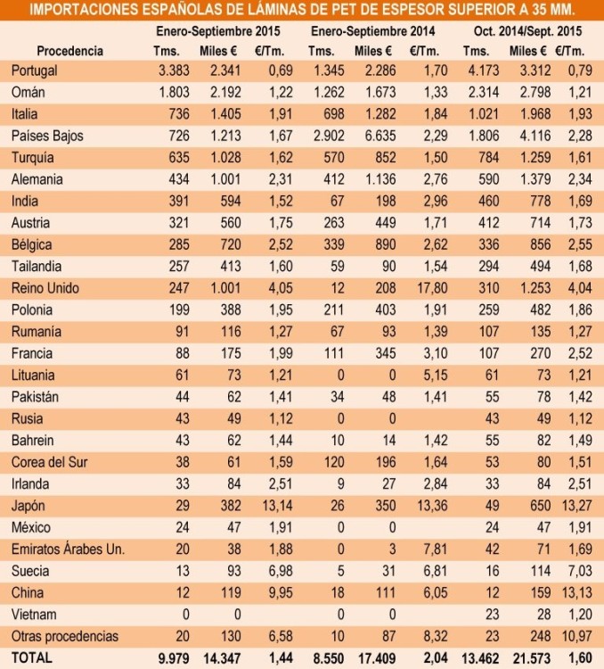 Lunes, 7 de diciembre de 2015 | Las importaciones españolas de láminas de PET de un espesor superior a 35 mm. realizadas en los nueve primeros meses de 2015 han crecido un 16,7%, respecto al mismo ...