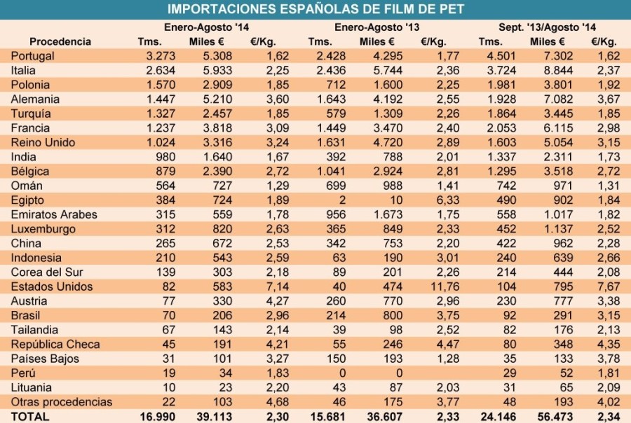 Lunes, 3 de noviembre de 2014 |  Las importaciones españolas de film de PET de un espesor no superior a 0,35 mm. aumentaron un 8,3% durante los ocho primeros meses de 2014, en tanto que el precio medio ...
