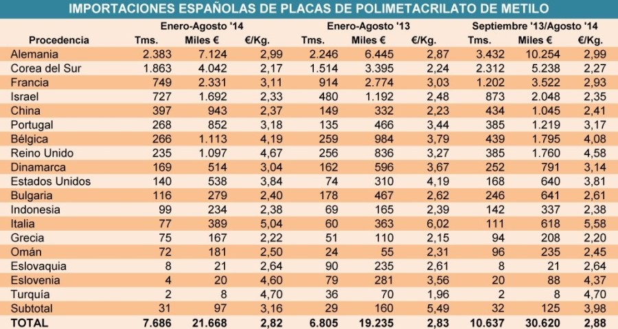 Lunes, 17 de noviembre de 2014 |  Las importaciones españolas de placas de polimetacrilato de metilo –PMMA- han aumentado un 12,9% en los ocho primeros meses de este año, en relación a enero-agosto ...