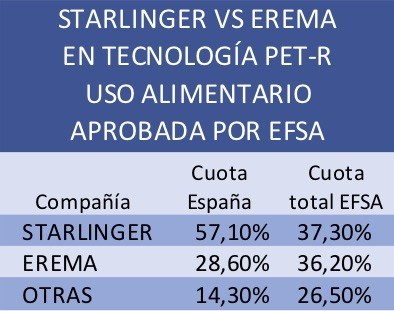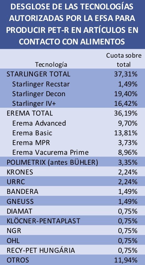 La hegemona de STARLINGER y EREMA emana de varios tipos de tecnologas que ambos fabricantes de maquinaria han ido desarrollando, destacando Starlinger W+ y Erema Basic, respectivamente de cada una de estas dos compaas. Estas dos firmas sustentan el 73,7% de todos los procesos aprobados por la EFSA para producir PET reciclado en contacto con alimentos y el 85,7% de los autorizados en Espaa.