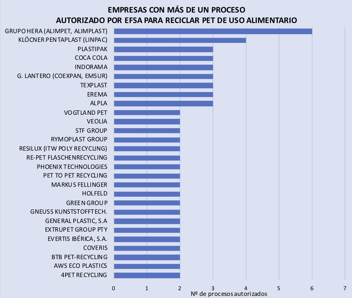 Los 134 procesos para producir PET reciclado alimentario autorizados por la EFSA pertenecen a 94 empresas o grupos empresariales, habiendo 27 empresas que disponen de ms de un mtodo de reciclado aprobado. Algunas de estas compaas disponen de la autorizacin en varias de sus plantas o de varios procesos aprobados en una misma planta.