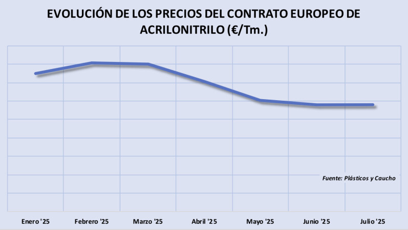 Jueves, 17 julio 2025 El precio del acrilonitrilo ha logrado remontar muy levemente en julio, tras las moderadas recuperaciones de los del petróleo y la nafta en el mes pasado. En concreto, el contrato europeo se cerró 2 ?/Tm ...