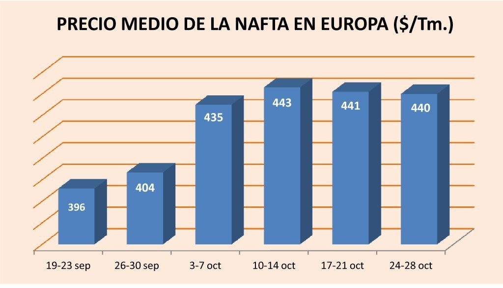 Jueves, 26 de octubre de 2017 | El precio de la nafta ha proseguido incrementándose en Europa durante la última semana completa de octubre, hasta situarse el pasado día 25 en 534,5 $/Tm.   El ...
