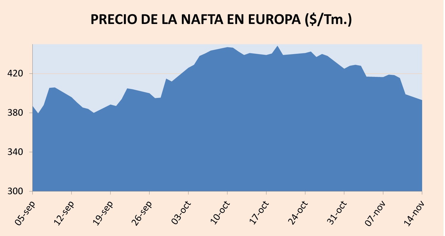 Martes, 22 de noviembre de 2016 | El precio de la nafta en Europa en encaramó el pasado lunes 21 a su nivel más alto desde principios de este mes, alcanzando, de media, los 429 $/Tm. CIF y cerrando al ...