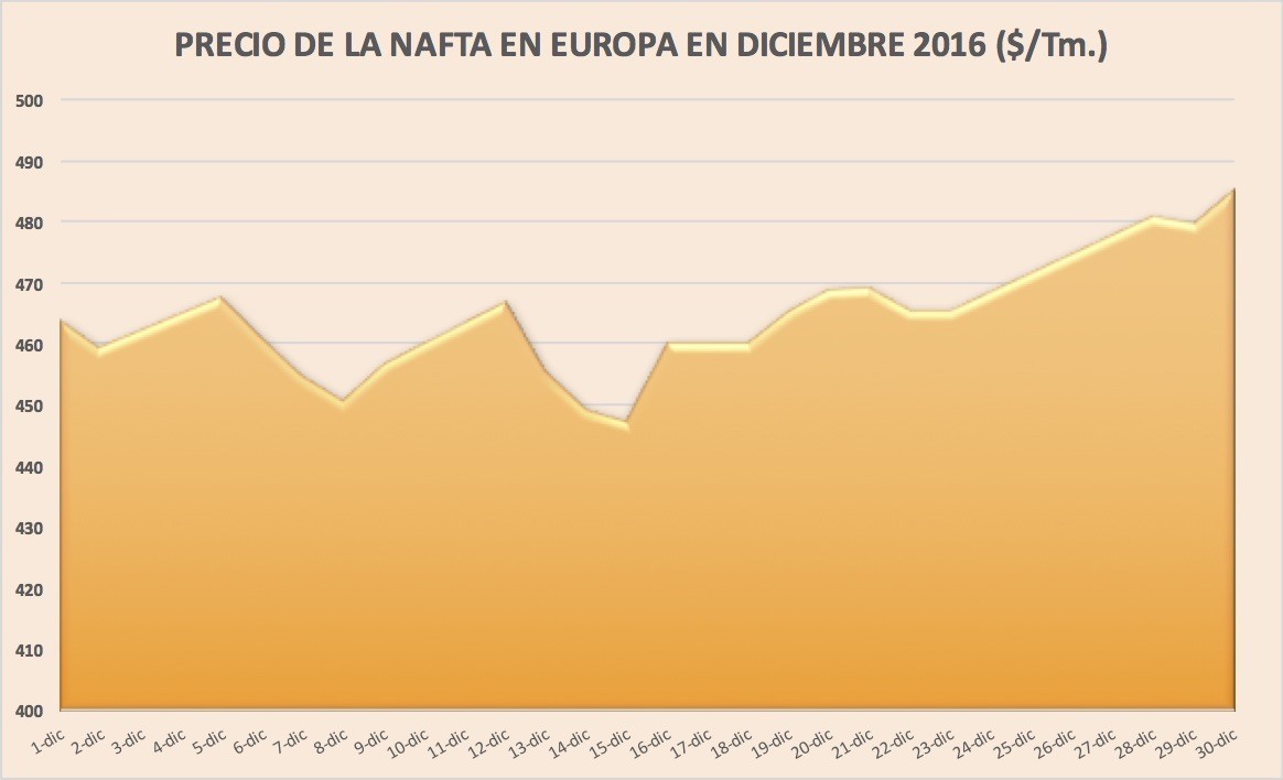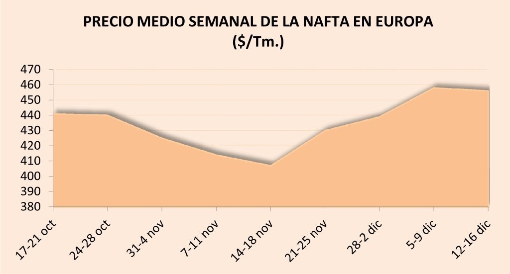 Lunes, 19 de diciembre de 2016 | Durante la tercera semana de diciembre, el precio medio de la nafta en Europa se ha mantenido en torno a los 455-460 $/Tm. CIF Rotterdam, prácticamente igual que en la ...