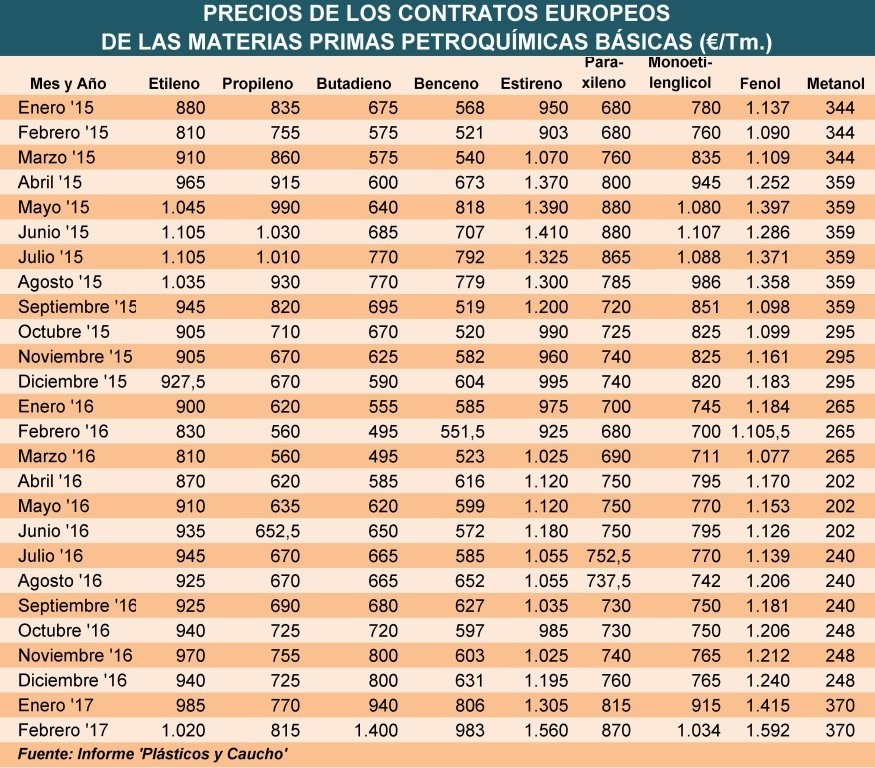 Lunes, 6 de febrero de 2017 | Pese a encaramarse hasta niveles que no alcanzaban desde el verano de 2015, las subidas de precios de los contratos europeos del etileno, propileno y paraxileno en febrero ...