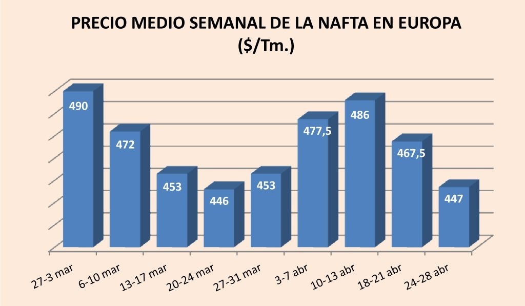 Lunes, 1 de mayo de 2017 | El precio de la nafta en Europa descendió por tercera semana consecutiva en Europa hasta situarse al finalizar abril en 445 $/Tm. CIF Rotterdam, lo que supuso un 6,8% menos ...