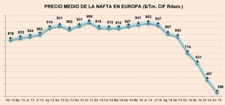 Lunes, 5 de enero de 2015 | El precio de la nafta continuó desmoronándose al inicio de 2015. El viernes 2 de enero, la materia prima petroquímica llegó a ofrecerse a 405 $/Tm. CIF Rotterdam, siendo ...