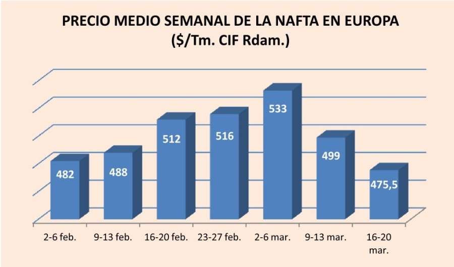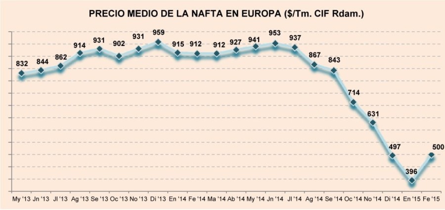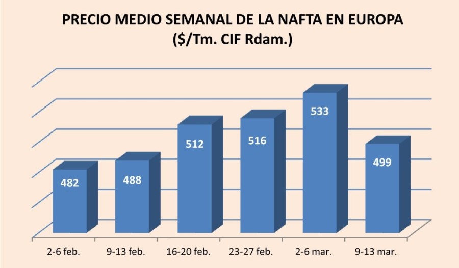 Lunes, 16 de marzo de 2015 | En la segunda semana de marzo, el precio medio de la nafta descendió de la cota de los 500 $/Tm. por primera vez desde un mes antes, situándose en 499 $/Tm. CIF ...