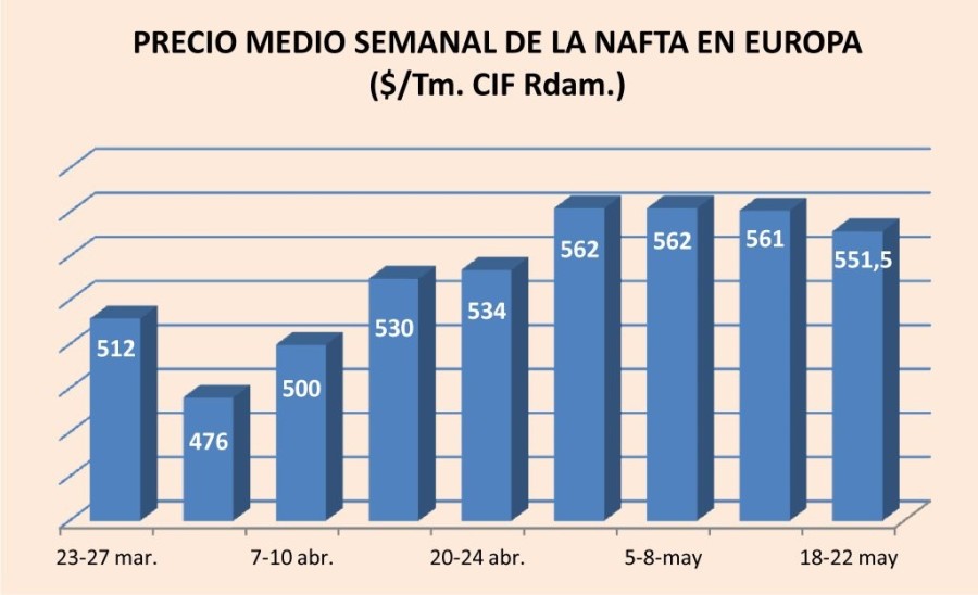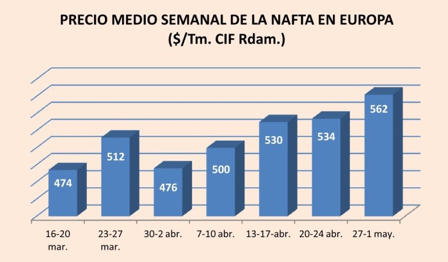 Lunes, 4 de mayo de 2015 |  El precio de la nafta alcanzó el pasado 1 de mayo en Europa los 571 %/Tm. CIF Rotterdam, lo que supuso un 4,2% más que una semana antes y un 13,7% más que el 1 de abril.   ...