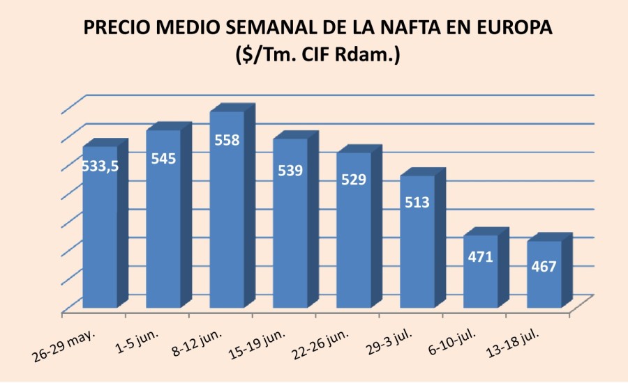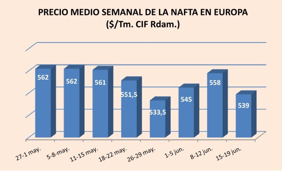 Lunes, 22 de junio de 2015 | El precio de la nafta en Europa fue de 526 $/Tm. CIF Rotterdam el día 19, lo que suponía un 6,1% menos que una semana antes. Fue su nivel más bajo desde el pasado 28 de ...