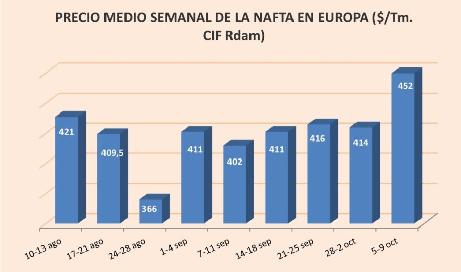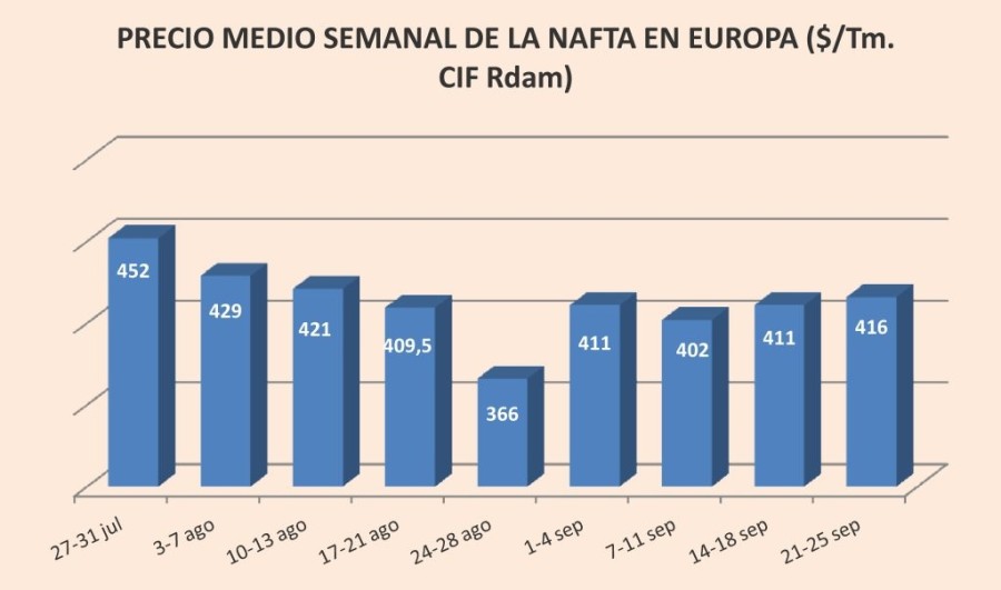 El precio de la nafta en Europa se resiste a perder la cota de los 400 $/Tm.