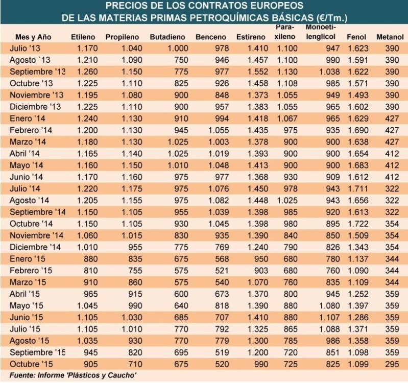 Lunes, 12 de octubre de 2015 | Los precios de los contratos europeos de las materias primas petroquímicas empleadas en la fabricación de termoplásticos descienden en octubre, pero la magnitud difiere ...