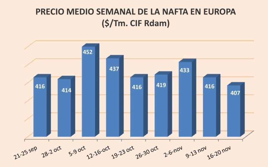 Lunes, 23 de noviembre de 2015 | El precio de la nafta en Europa ha continuado bajando durante la tercera semana de noviembre hasta situarse, de media, en 407 $/Tm. CIF Rotterdam, un 6% menos que dos ...