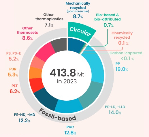 Producción mundial de plásticos en 2023 y cuota por tipo de polímero. Fuente: Plastics Europe.