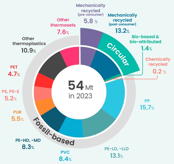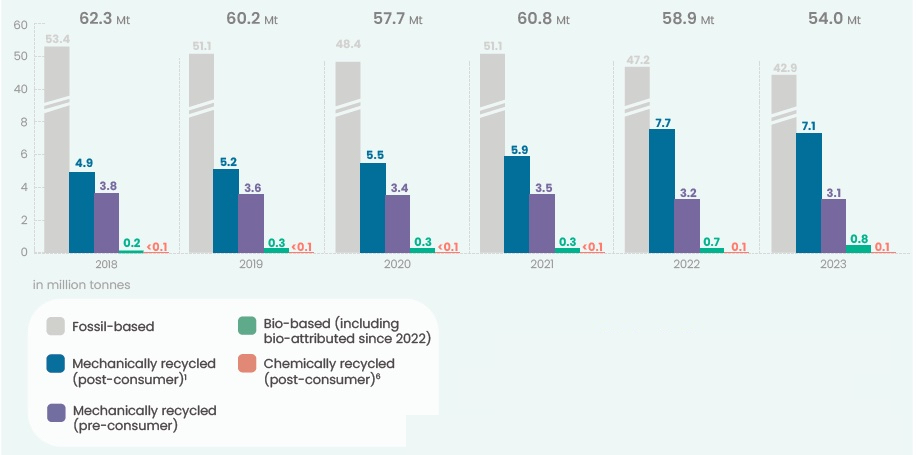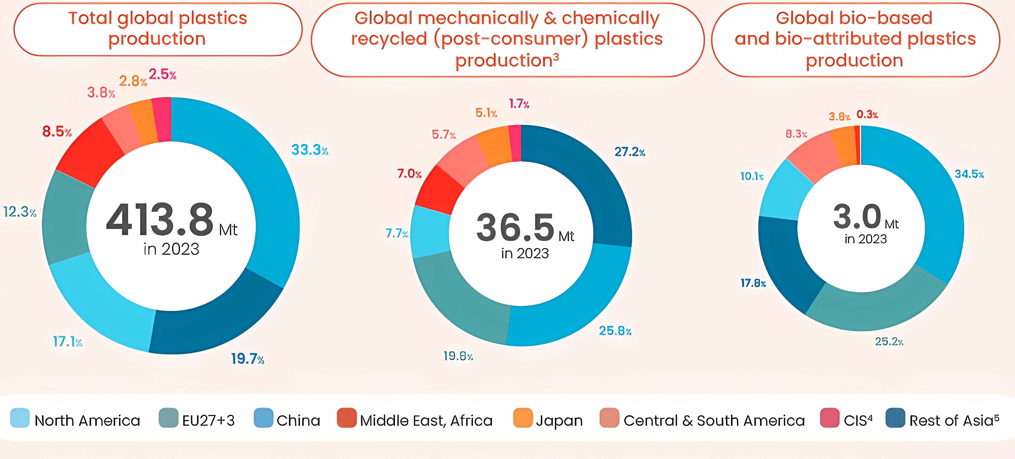 En los plásticos posconsumo reciclados mecánicamente y químicamente, la producción global aumentó de 35,5 Mt en 2022 a 36,2 Mt en 2023. Europa redujo su participación del 21% en 2022 al 19,8% en 2023, mientras que China incrementó su cuota hasta el 25,8%, desde el 24% del año anterior.
