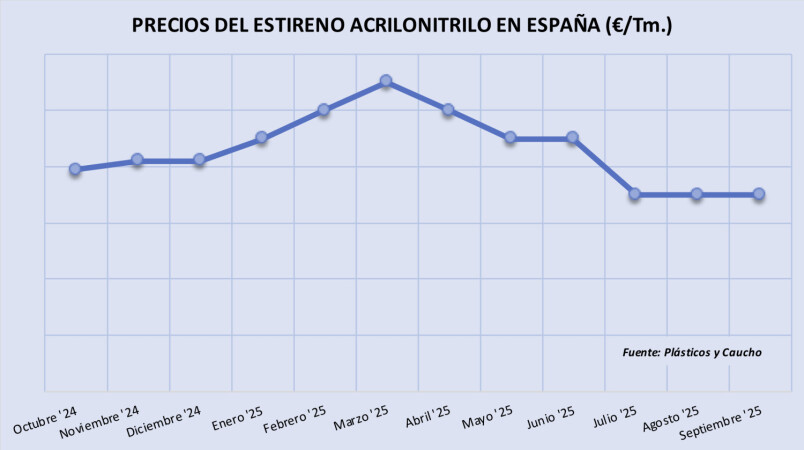 Viernes, 3 octubre 2025 El precio del estireno acrilonitrilo (SAN) ha bajado significativamente durante el tercer trimestre del año, cuando ha acumulado una reducción media de