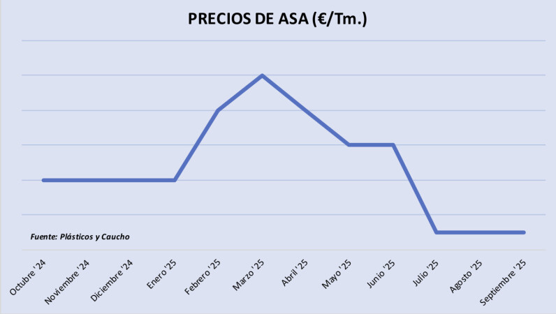 Jueves, 2 octubre 2025 Los precios del acrilonitrilo estireno acrilato (ASA) han acumulado un descenso de unos