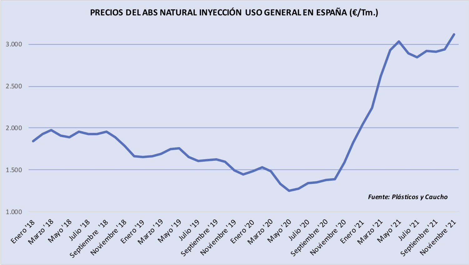 Martes, 7 de diciembre de 2021 | Los precios del acrilonitrilo-butadieno-estireno (ABS) batieron un récord en noviembre pasado, cuando duplicaron, prácticamente, el nivel de un año antes. En diciembre, ...