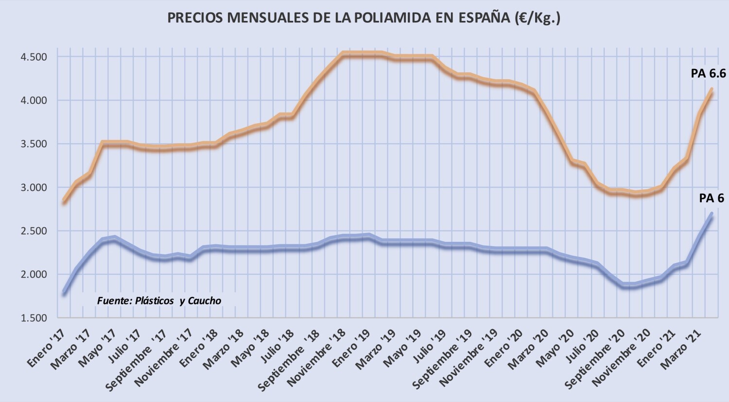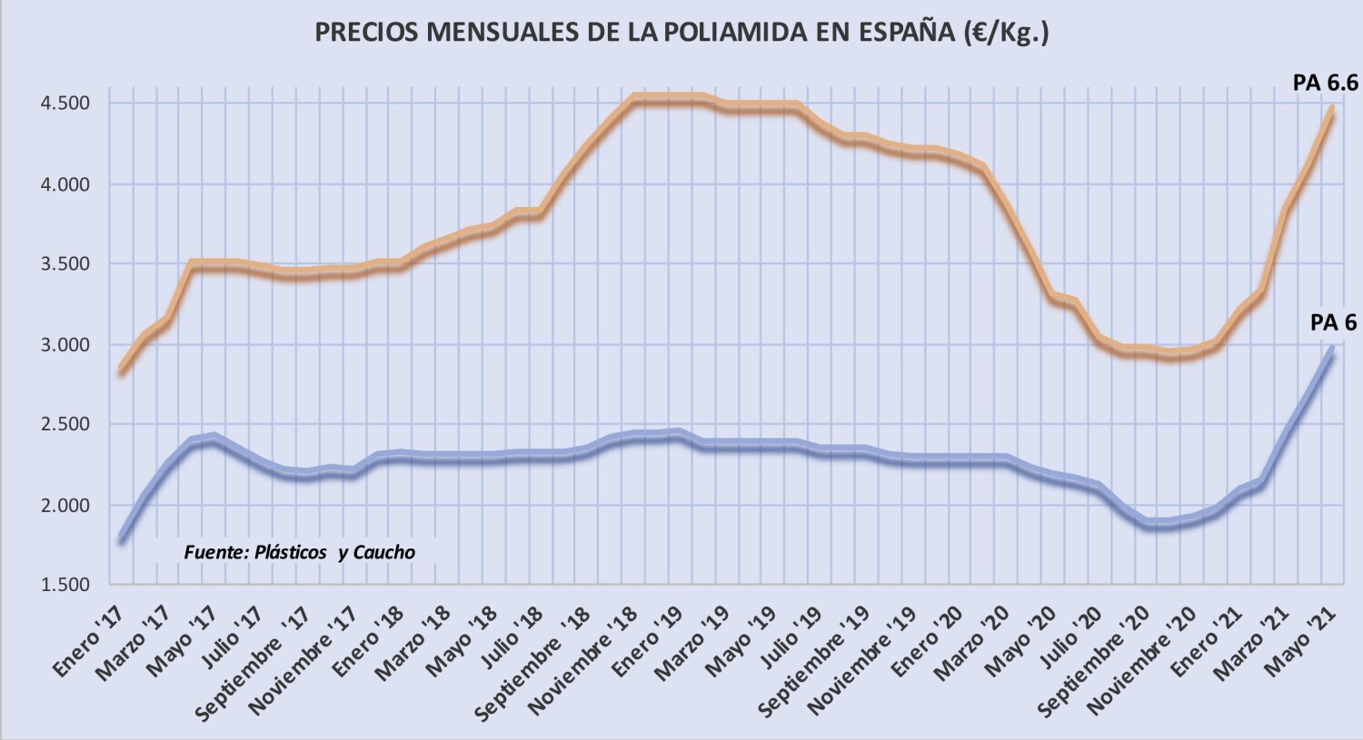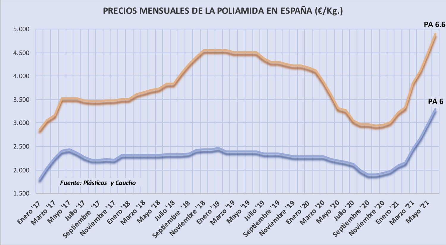 Miércoles, 9 de junio de 2021 | Poco se desvió el incremento de los precios de la poliamida 6 y de la poliamida 6.6 en mayo con respecto la de abril y se espera que sigan aumentando fuertemente en ...